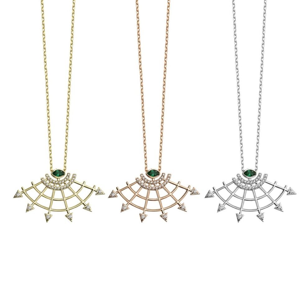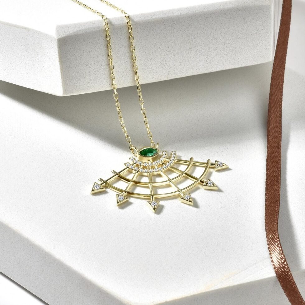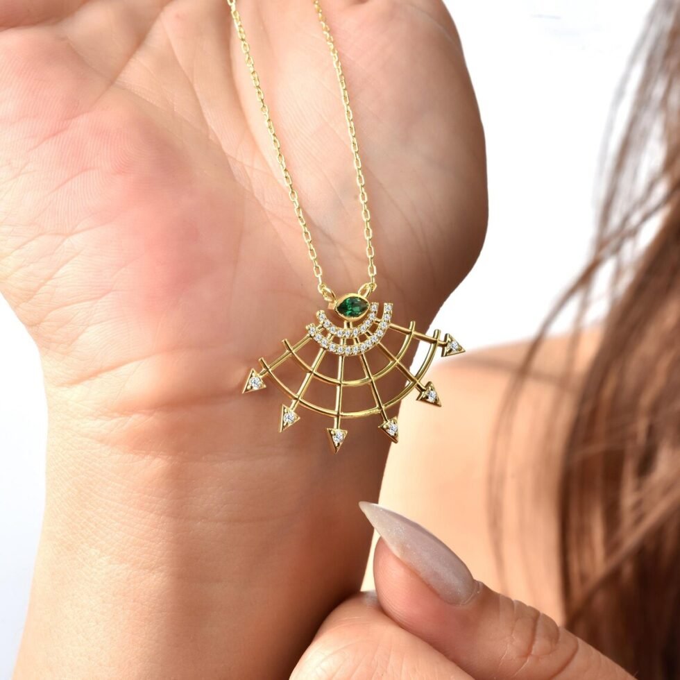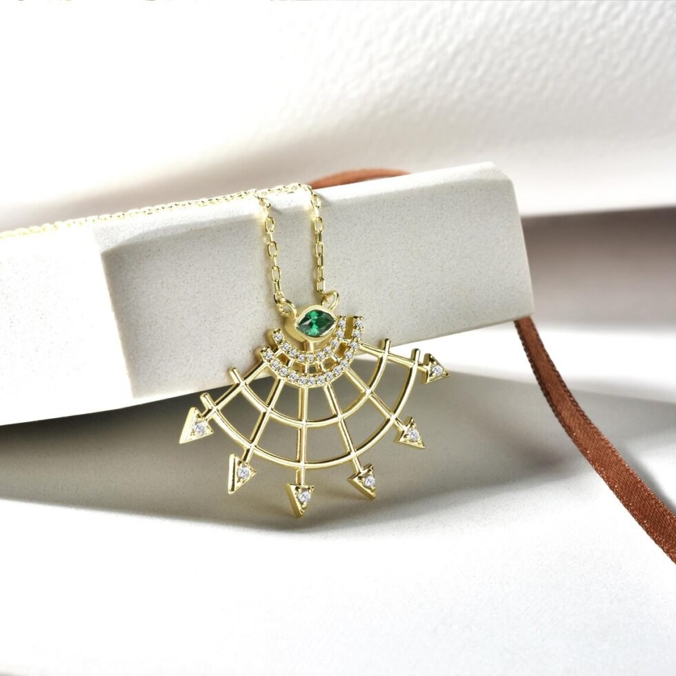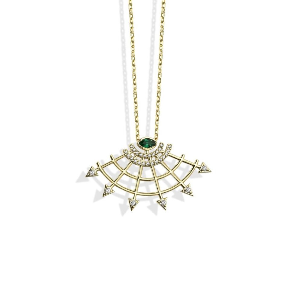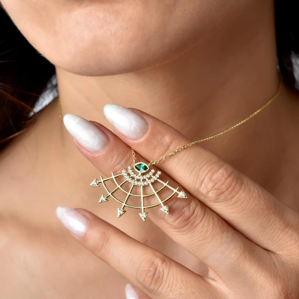 The fan has long been a symbol of elegance, nobility, and wisdom across many cultures. This necklace, with its golden fan motif, offers both aesthetic grace and deep symbolic meaning. The fan, adorned with diamonds, reflects light and represents opulence and luxury, while the emerald at the center symbolizes wisdom and spiritual depth. The unfolding fan evokes new beginnings and strong steps toward the future. Wearing this necklace means carrying not just a beautiful piece of jewelry, but also a symbol of strength and significance.