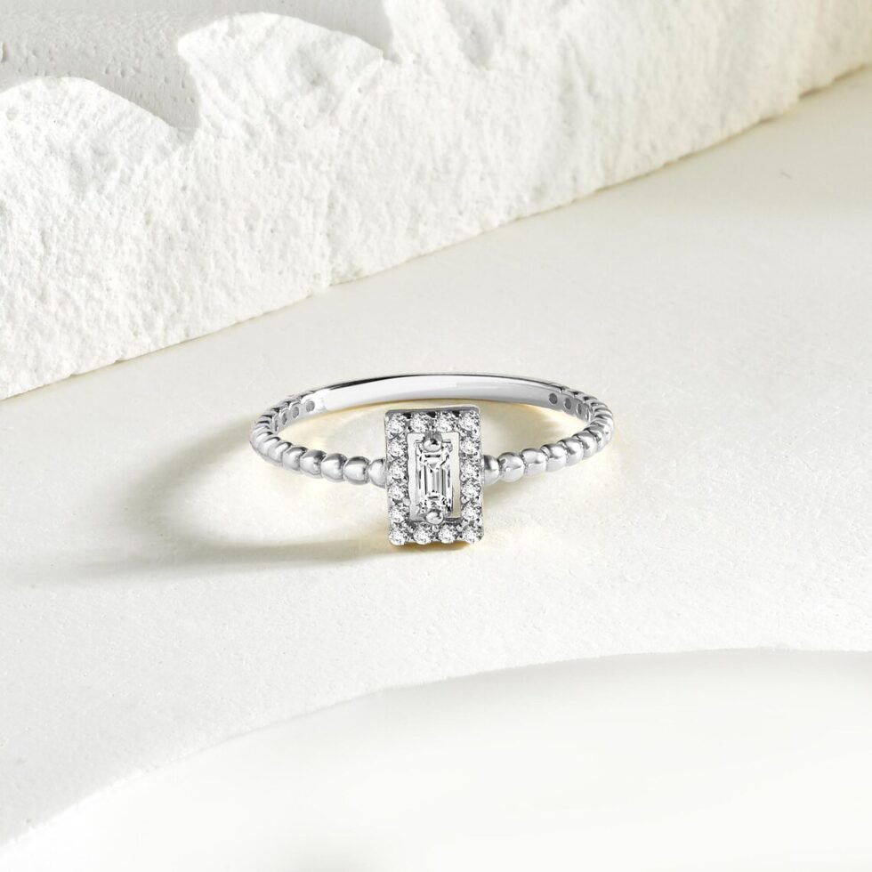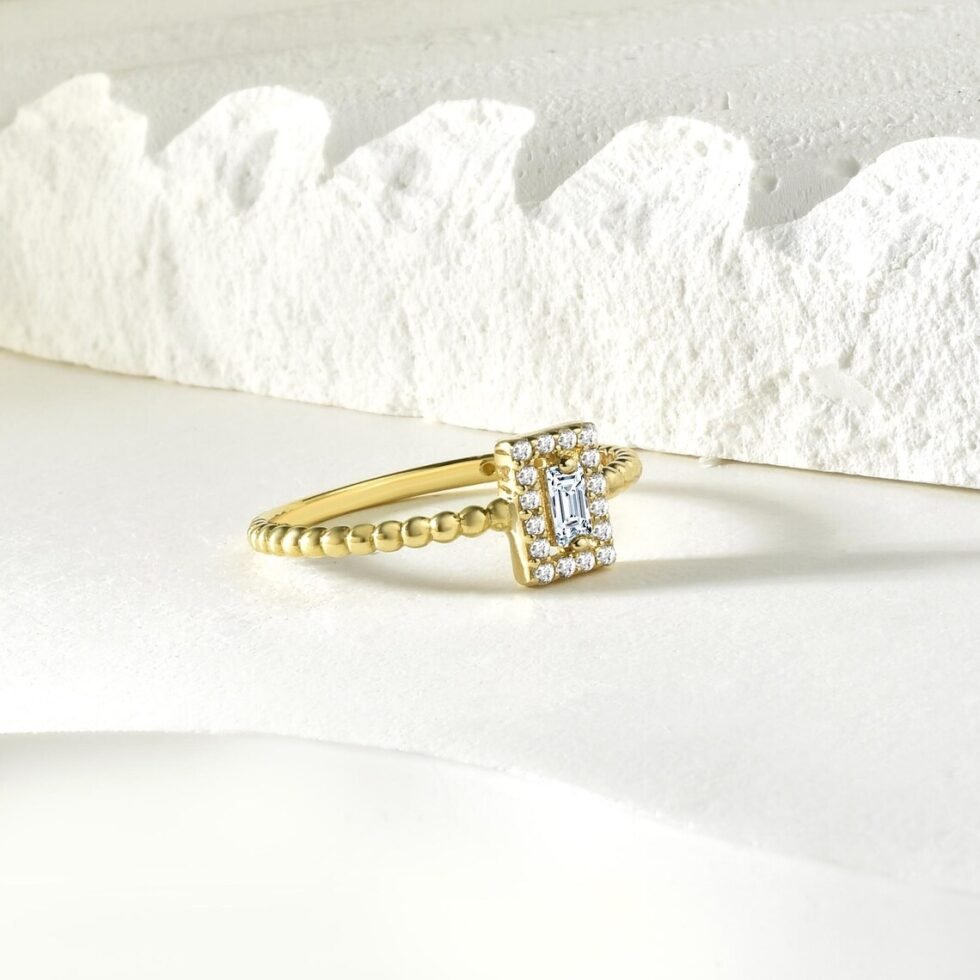 Enhance your look with this stunning 14K gold ring, featuring a 0.20ct baguette diamond framed by a halo of brilliant round diamonds. The minimalist design exudes sophistication and classic elegance, making it a timeless addition to any jewelry collection.
