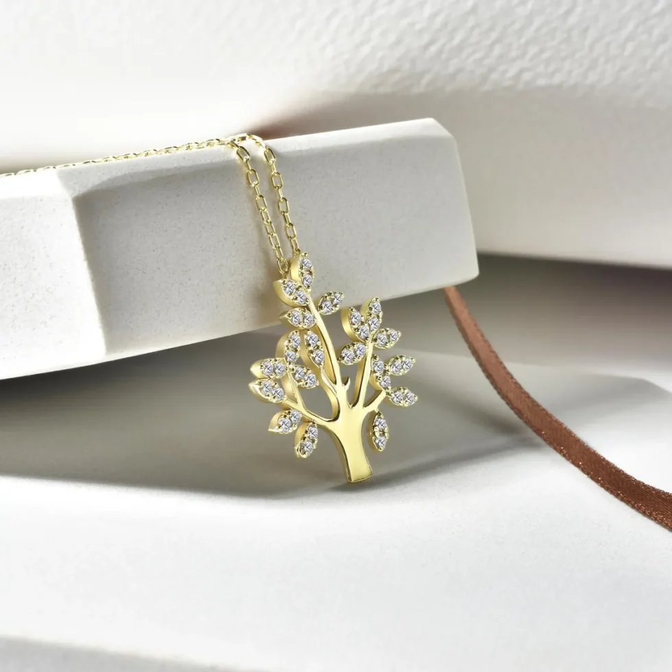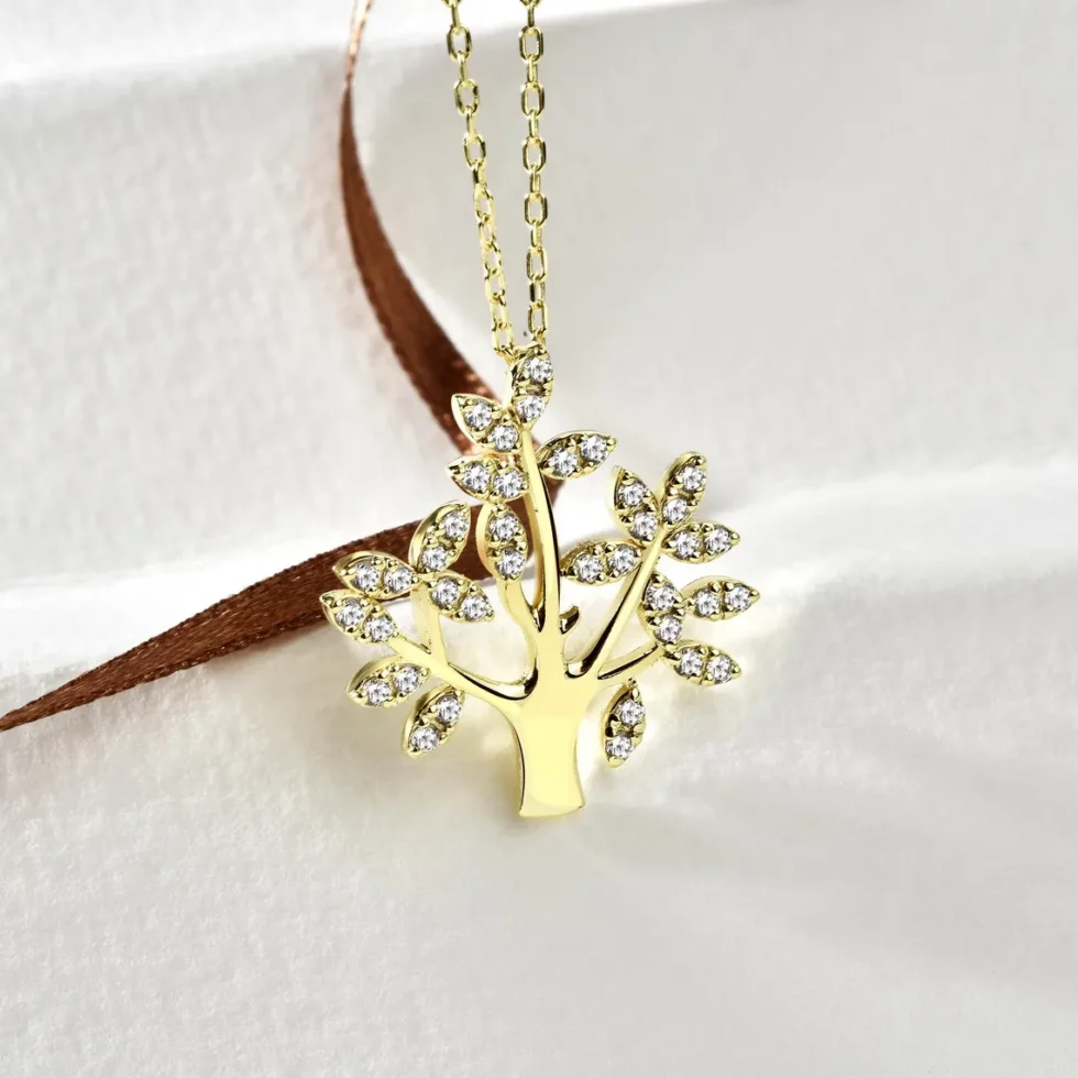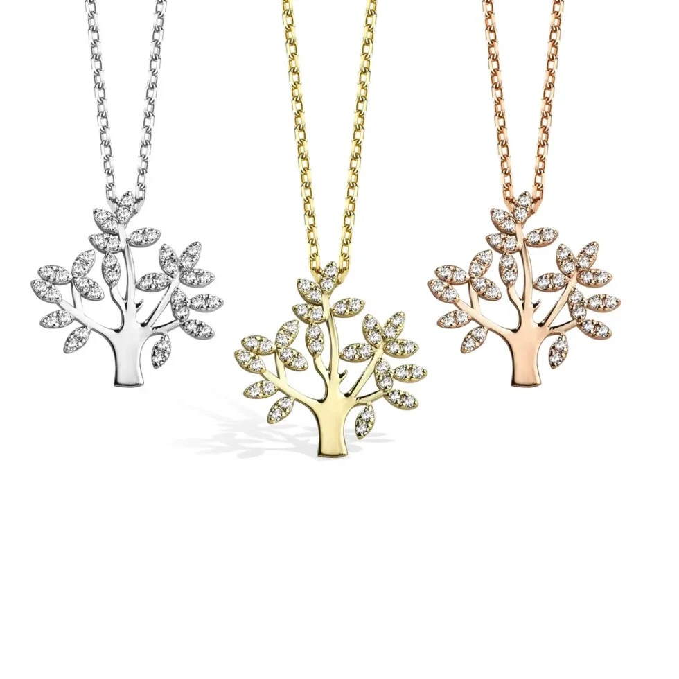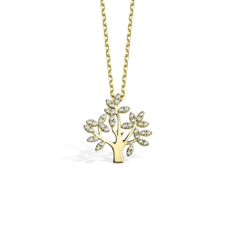 This 14K diamond tree of life necklace holds deep symbolic meaning in many cultures. The tree of life often represents the cycle of life, growth, strength, and connections. Its roots reach deep into the earth, while its branches extend towards the sky, symbolizing a bridge between the physical world and the spiritual realm. Each leaf represents individual growth and the different experiences in life. The diamonds add an element of light and purity, enhancing the elegance of this meaningful symbol.