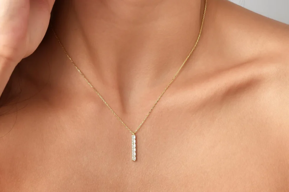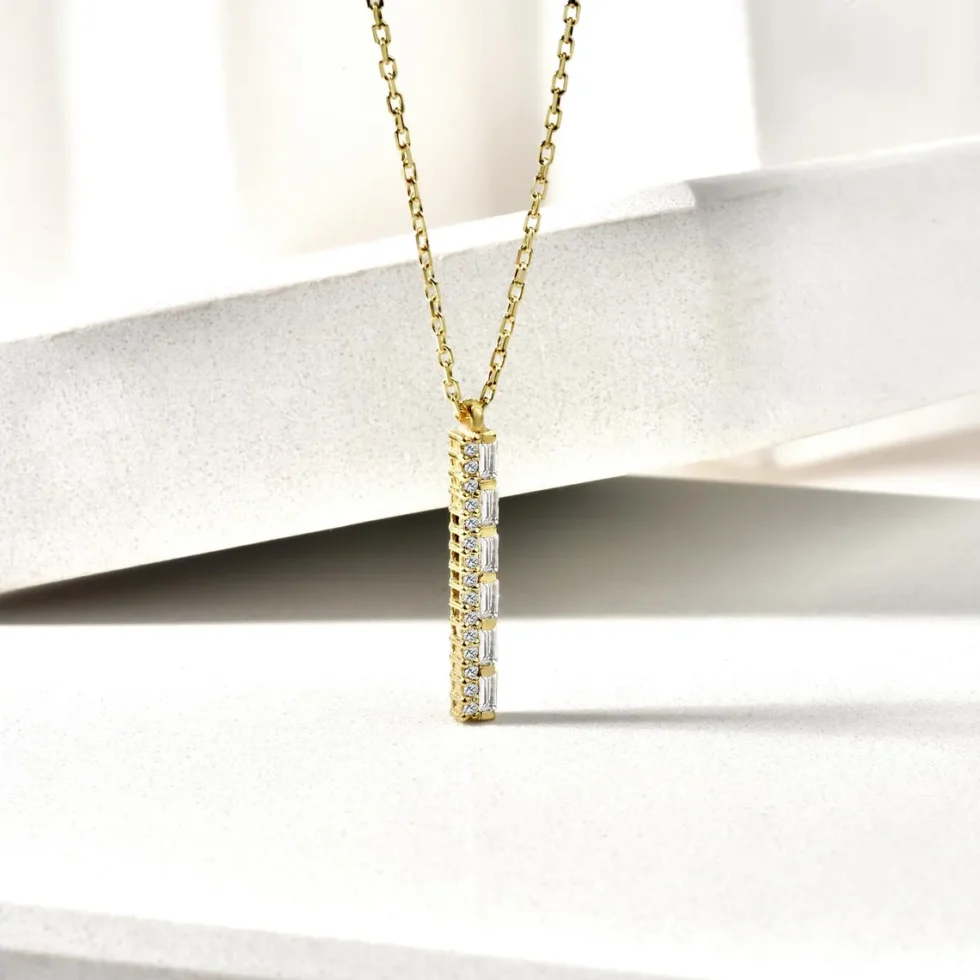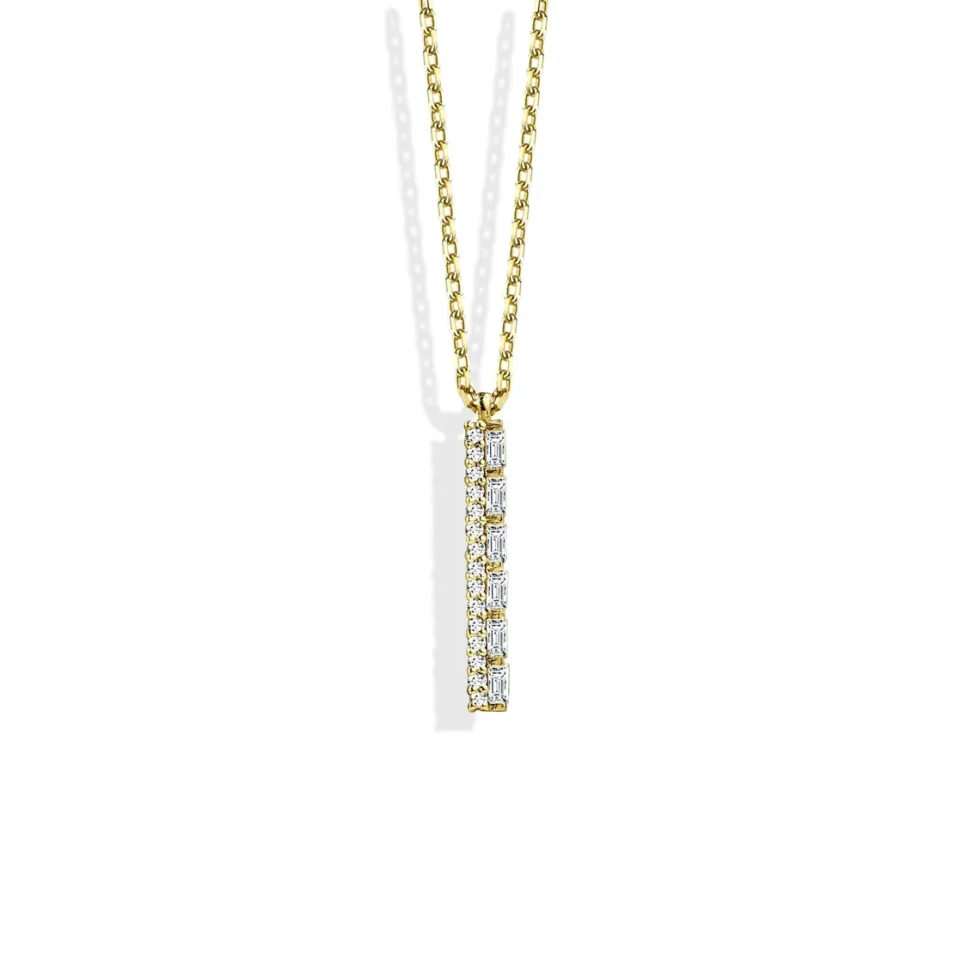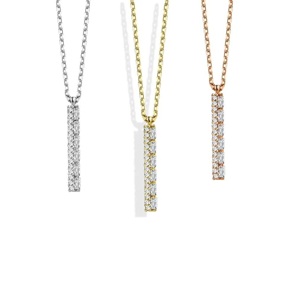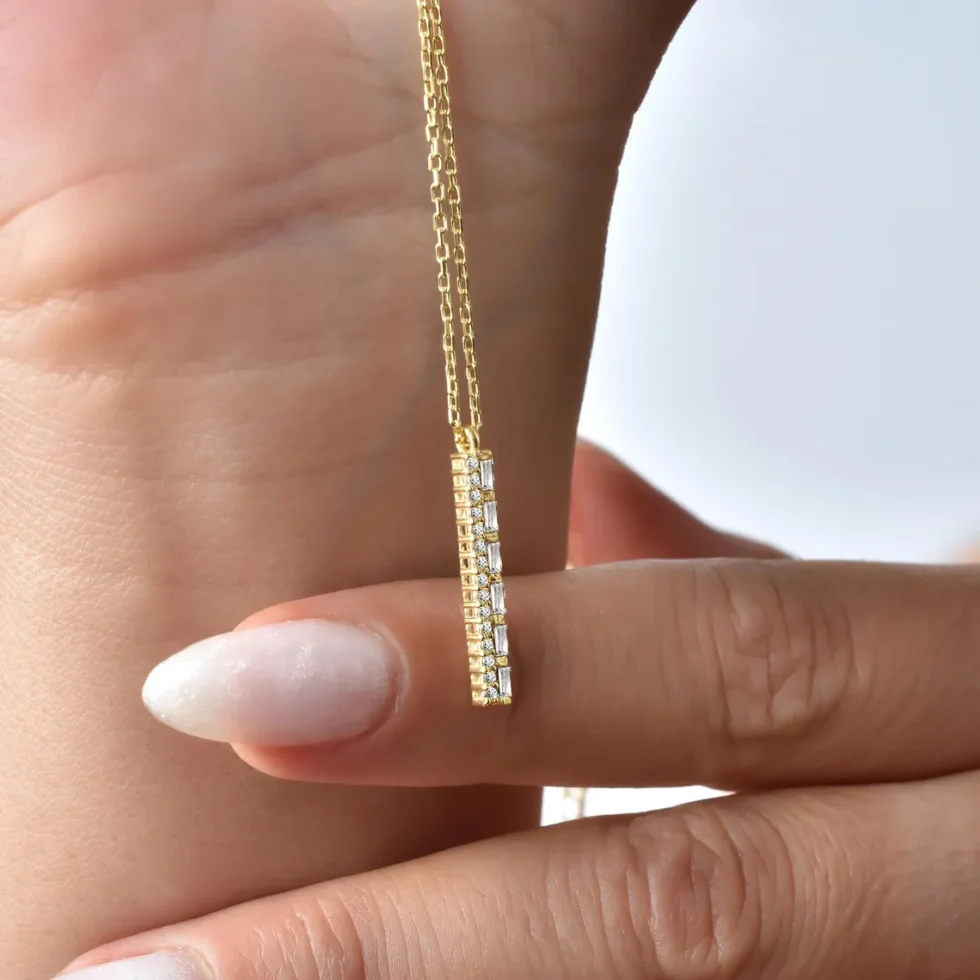 This stunning 14K gold necklace features a delicate vertical bar pendant set with a row of baguette and round-cut diamonds. The combination of baguette and round diamonds adds a modern yet timeless appeal, perfect for those who appreciate refined elegance. Whether worn alone or layered with other necklaces, this piece adds a sophisticated sparkle to any outfit. A beautiful choice for a special occasion or as a cherished addition to your everyday jewelry collection.