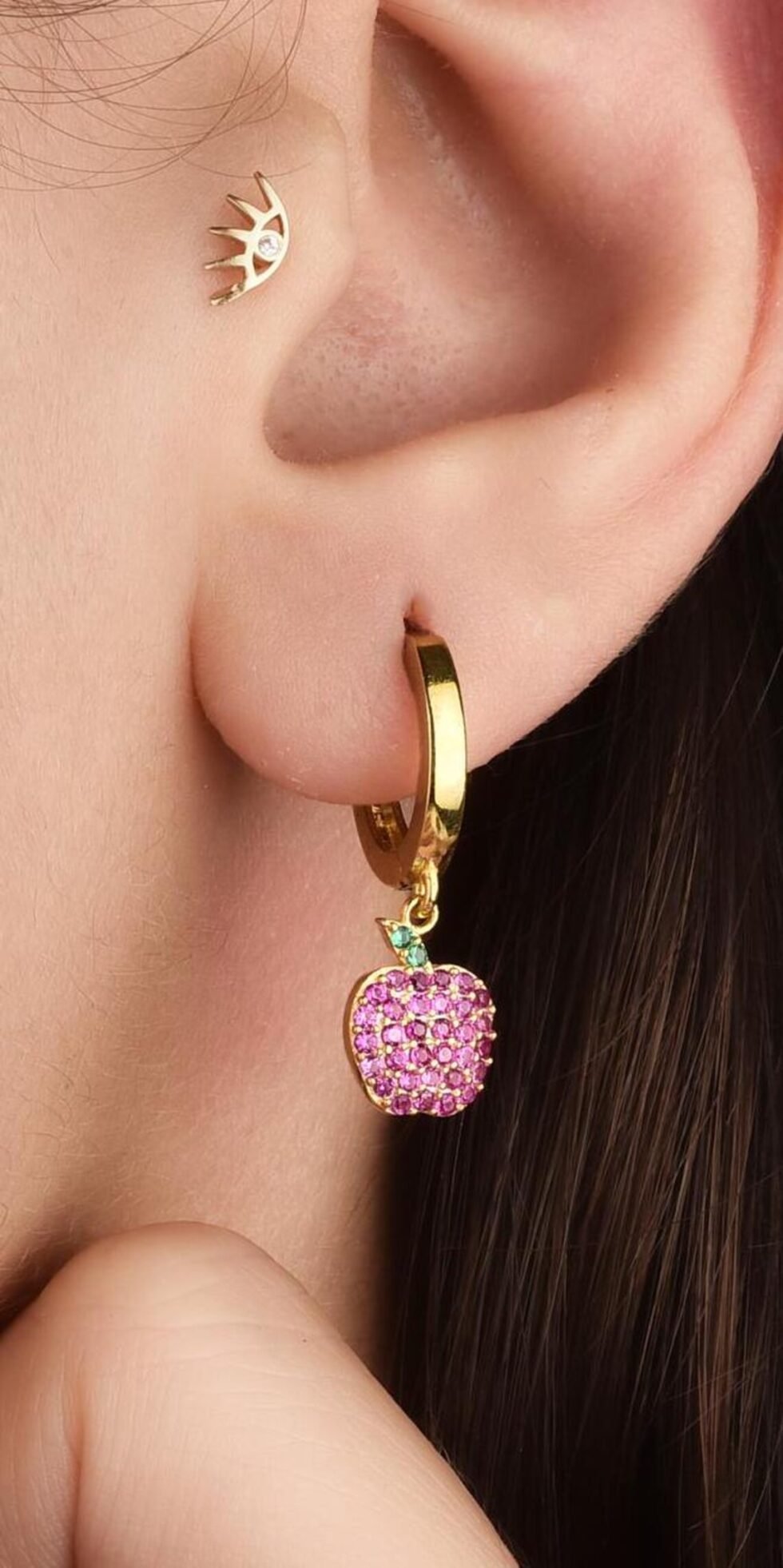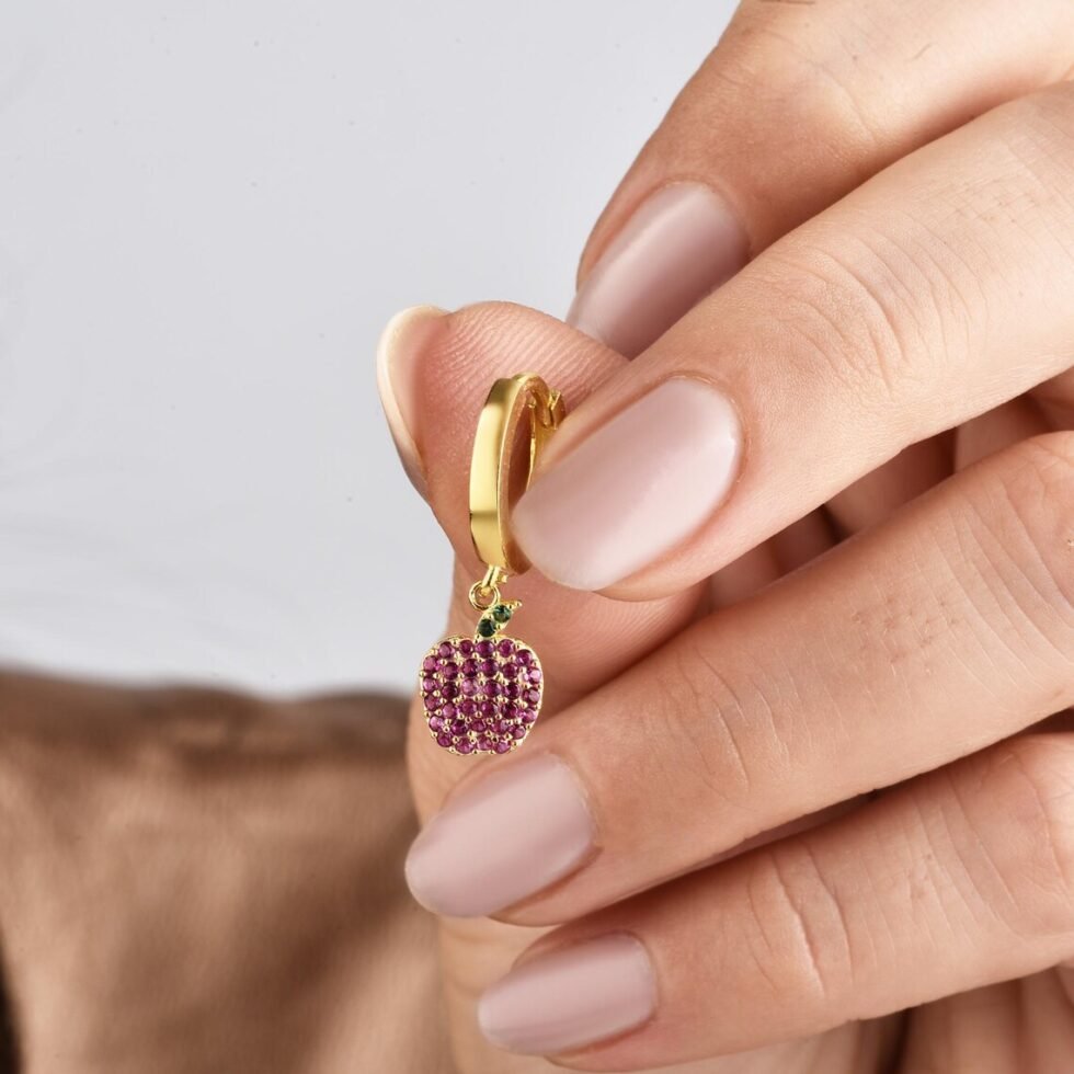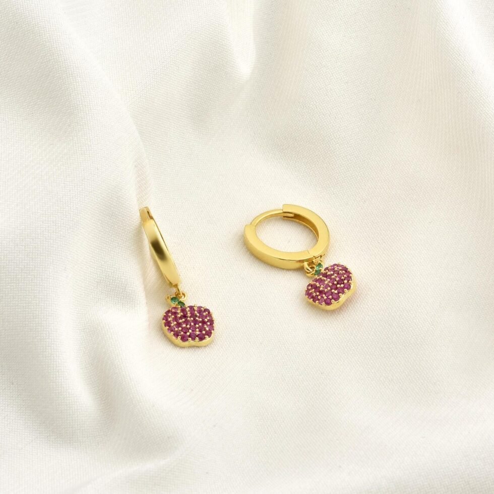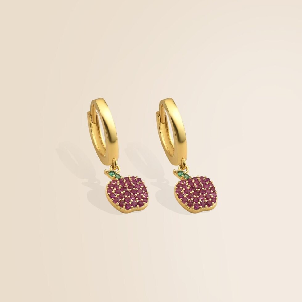 Apple Huggie Hoop Earrings in 14K Gold – Ruby Pavé Charm with Emerald Leaf, Handmade Fine Jewelry, Dainty Everyday Luxury