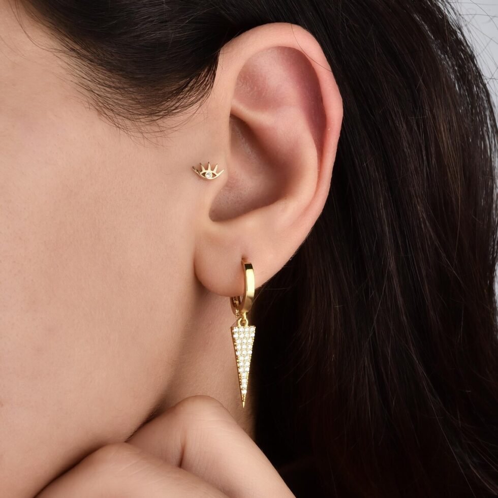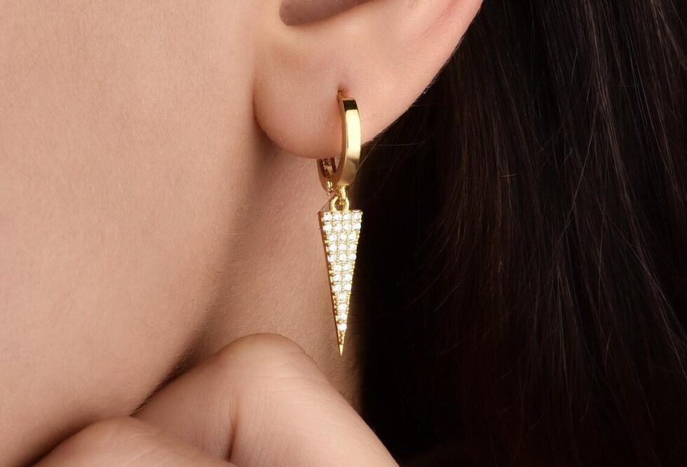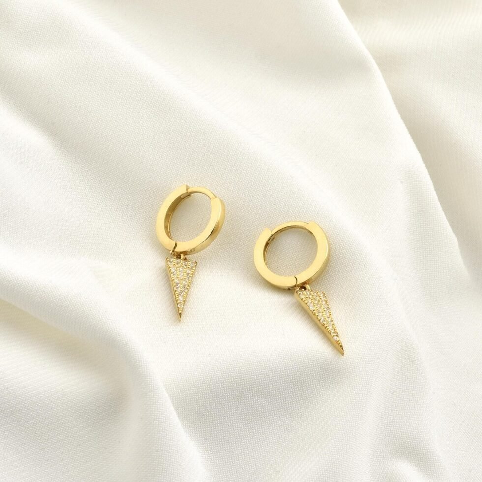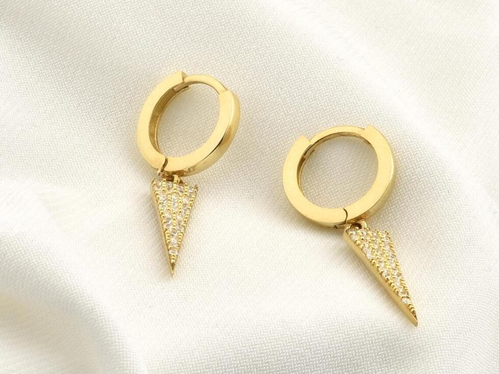 Add a bold yet elegant touch to your jewelry collection with these stunning 14K solid gold hoop earrings. Featuring sleek, dangling triangle charms encrusted with sparkling pavé diamonds, these earrings offer a perfect blend of modern sophistication and timeless luxury. Ideal for everyday wear or special occasions, they make a dazzling statement piece.