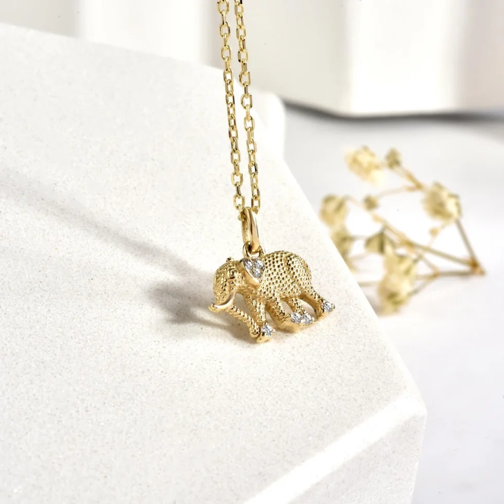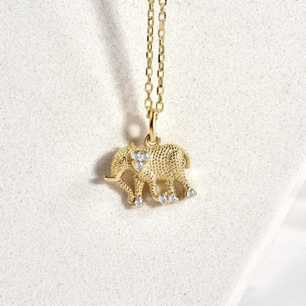 This 14K real gold minimalist elephant necklace brings together elegance and meaningful symbolism. Handcrafted with intricate details, this necklace represents strength, wisdom, trust, and luck, qualities often associated with elephants. Its carefully textured surface and diamond-like stone accents add a unique sparkle. With a design that complements both modern and classic styles, it is an ideal accessory to accompany you at all times, instilling a sense of trust and carrying luck wherever you go. Perfect as a thoughtful gift for loved ones or a special piece to add a personal touch for yourself.